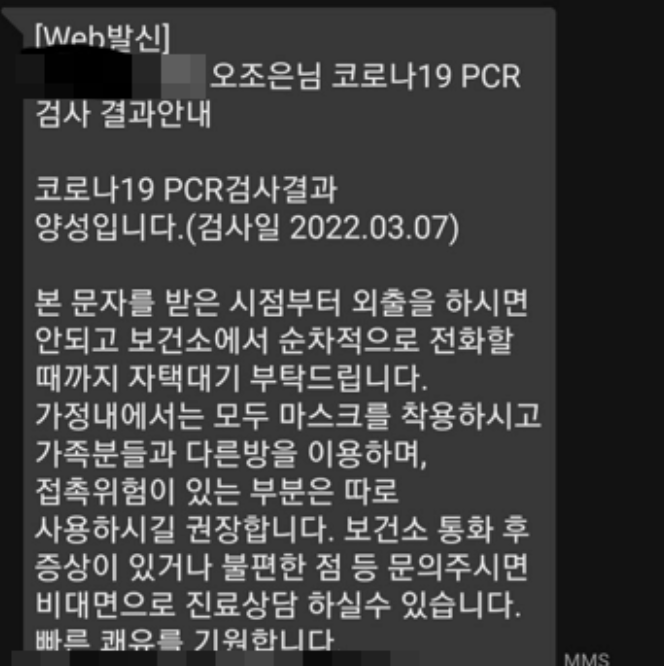 뚜밥이 올린 공지에는 PCR 양성 판정을 받았던 문자 내역을 공개했는데, 문자 내용에는 양성 판정임을 확인하는 내용과 함께 자가 격리 안내가 담겨 있었다.