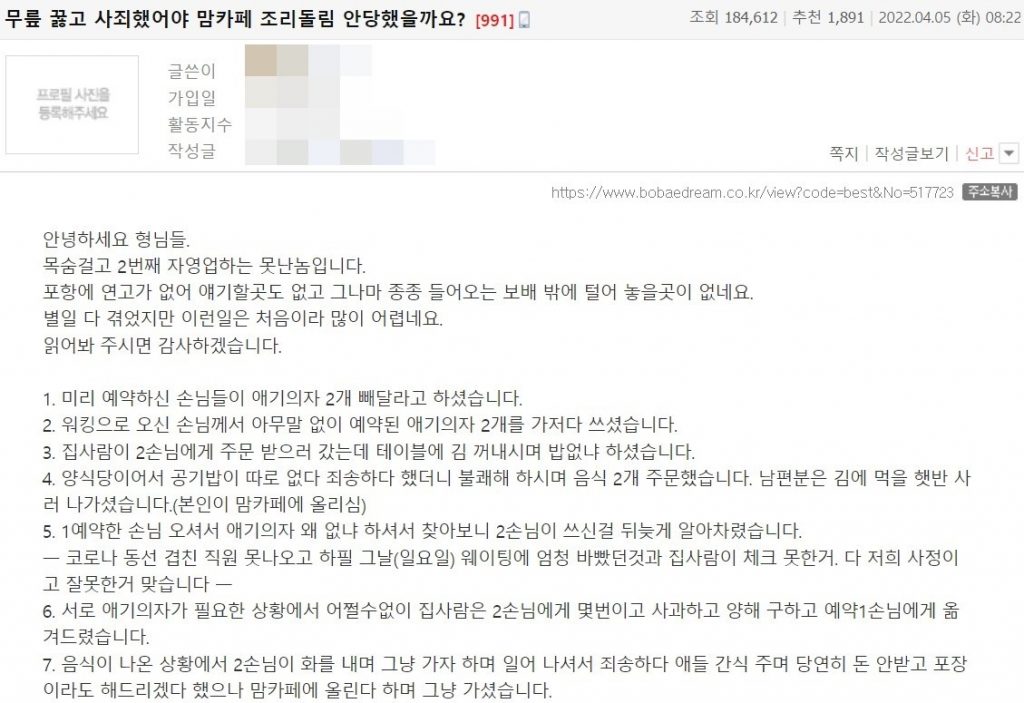 지난 5일 국내 온라인 커뮤니티 보배드림에는 ‘무릎 꿇고 사죄했어야 맘케페 조리돌림 안 당했을까요’라는 제목의 글이 게재돼 네티즌들의 이목을 끌었다.