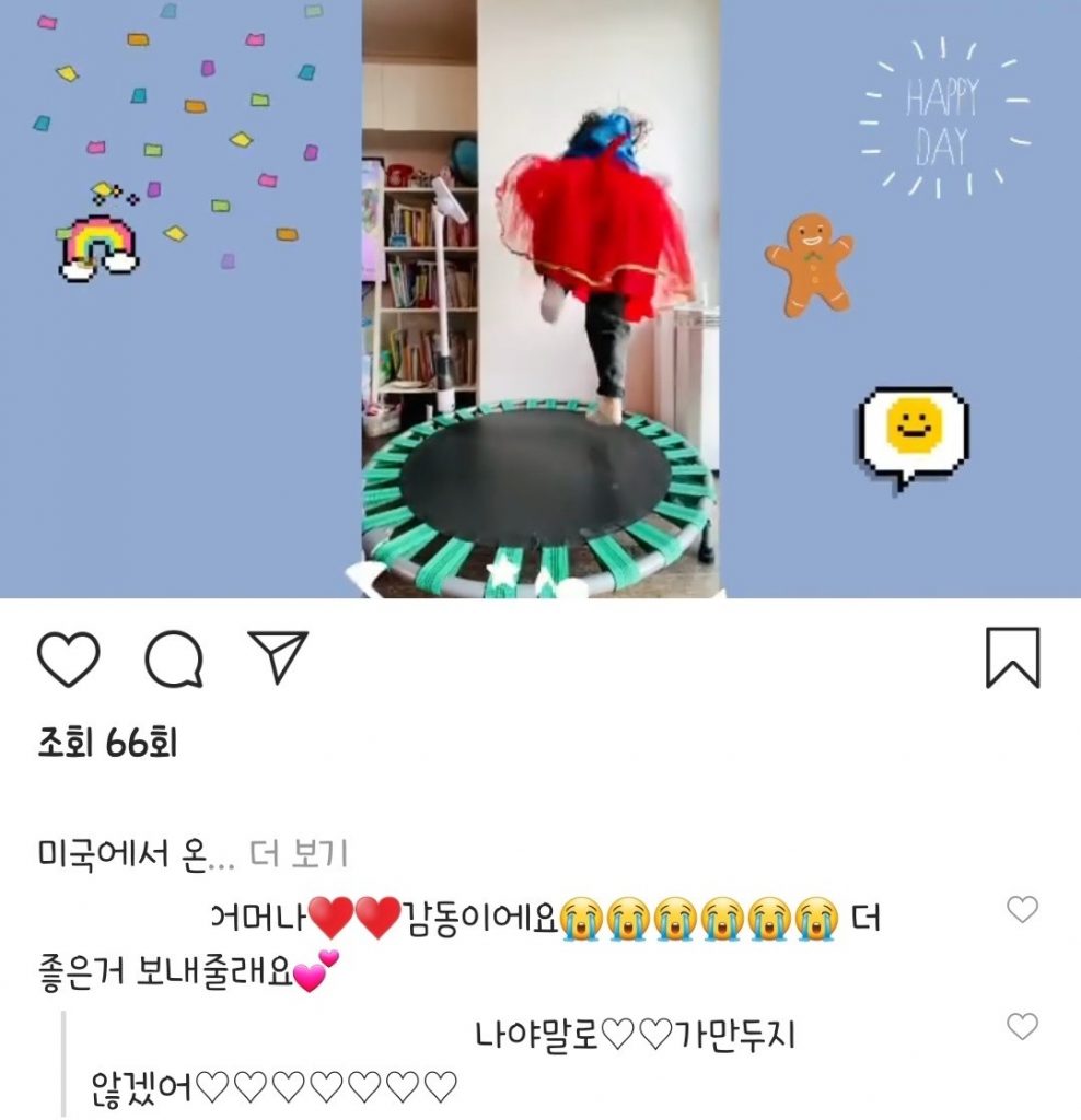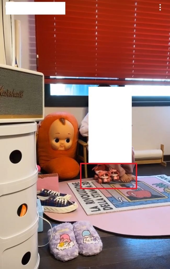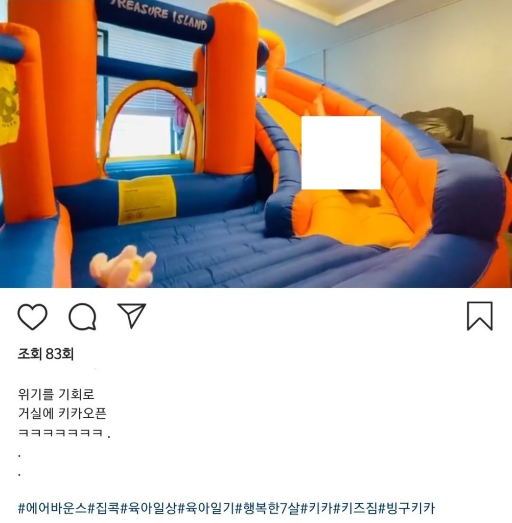 B 씨가 공개한 사진에는 집 한 켠에 마련된 트램폴린, 장난감 뾰족 구두를 신고 거실을 활보하는 아이, 거실에 에어바운스를 설치한 모습 등이 담겼다.