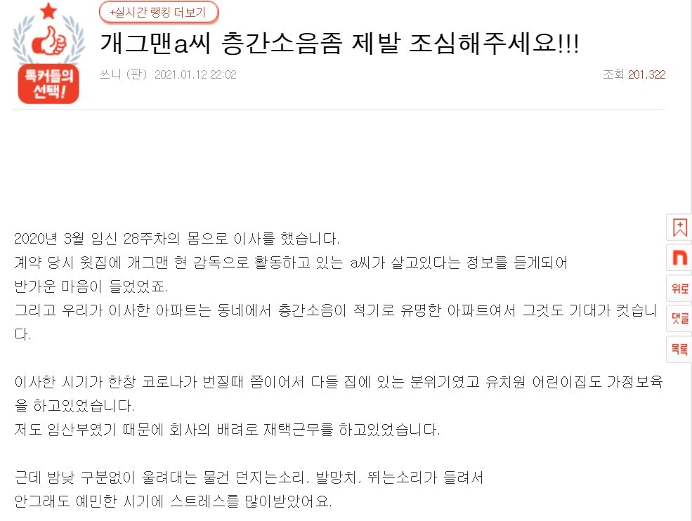 지난 12일 네이트판에는 ‘개그맨 A 씨 층간소음 좀 제발 조심해주세요’라는 제목의 글이 올라왔습니다.