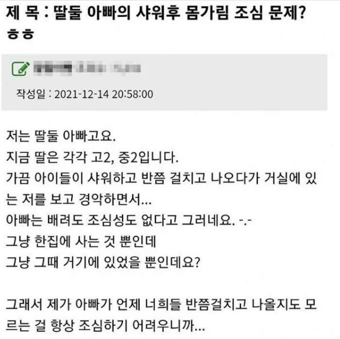 최근 각종 온라인 커뮤니티에는 지난해 12월 딸 둘을 둔 아버지가 올린 고민 글이 재조명됐는데, 아버지 A씨는 중학교 2학년과 고등학교 2학년인 딸 두 명을 키우고 있다.