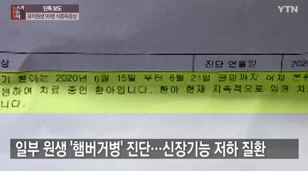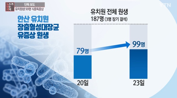 24일 YTN은 경기도 안산에 있는 한 유치원에 다니는 원생 99명이 식중독 의심 증상을 보였다고 보도했다.