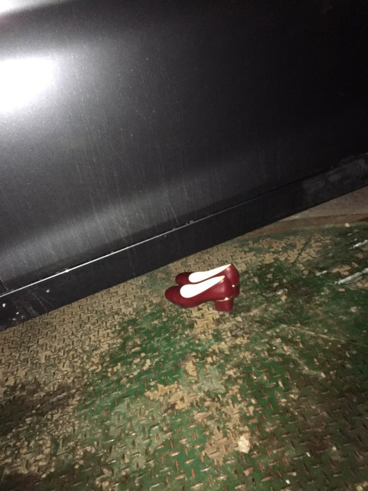그래서 내려가 보았더니 이렇게 누가 차 밑에 거의 새거같은 빨간구두 가지런히 놓고갔어요…ㅠㅠ