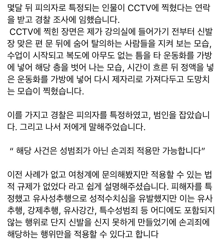 이어 “누군지도 모르는 정액의 주인이 제가 누군지 아는 것이 싫었다”며 “학교 인권센터를 통해 의사를 전달했으나 돌아온 답변은 ‘손괴죄가 적용되면 내는 벌금이 합의금보다 적기 때문에 결렬됐다’는 답이었다”고 설명했다. 이후 피의자는 50만원이라는 벌금형으로 약식기소됐다.