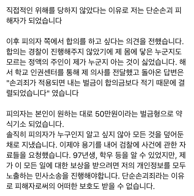 A씨는 “직접적인 위해를 당하지 않았다는 이유로 저는 단순손괴 피해자가 되었다”며 이후 피의자쪽에서 합의를 시도한 정황을 전했다.