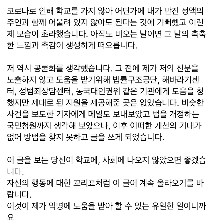 마지막으로 “법률구조공단, 해바라기 센터, 성범죄상담센터, 동국대인권위 같은 기관에 도움을 청했지만 제대로 된 지원은 없었다. 국민청원까지 생각했으나 어떤 개선의 방법이 없어 글을 쓰게 됐다”면서 피의자를 향해 “이 글을 보는 당신이 학교에, 사회에 나오지 않았으면 좋겠다”고 덧붙였다.