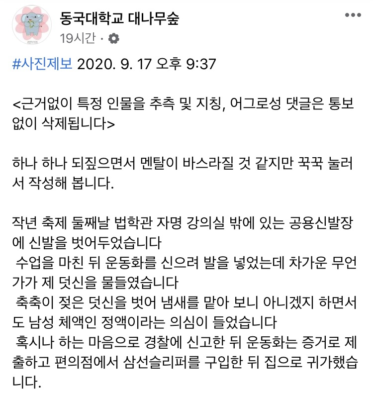 동국대 대나무숲에 한 여학생이 “운동화에 정액 테러 당했다”는 제보를 하며 이에 대한 관심이 높아지고 있다.