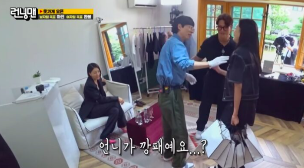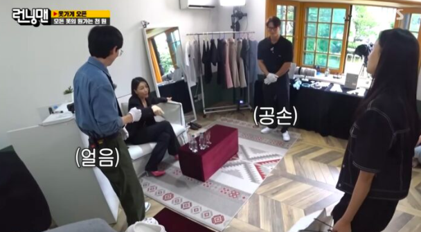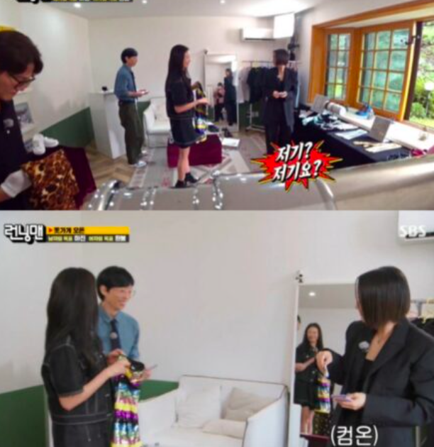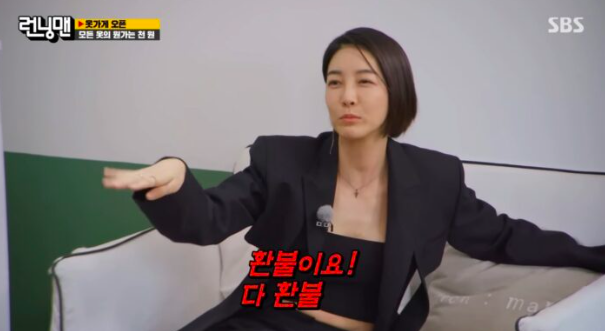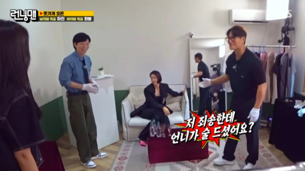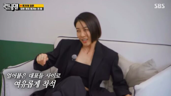 진서연이 오자마자 런닝맨 멤버들과 인사도 나누지 않고 소파에 가서 앉더니 다리를 꼬는 모습이었다.