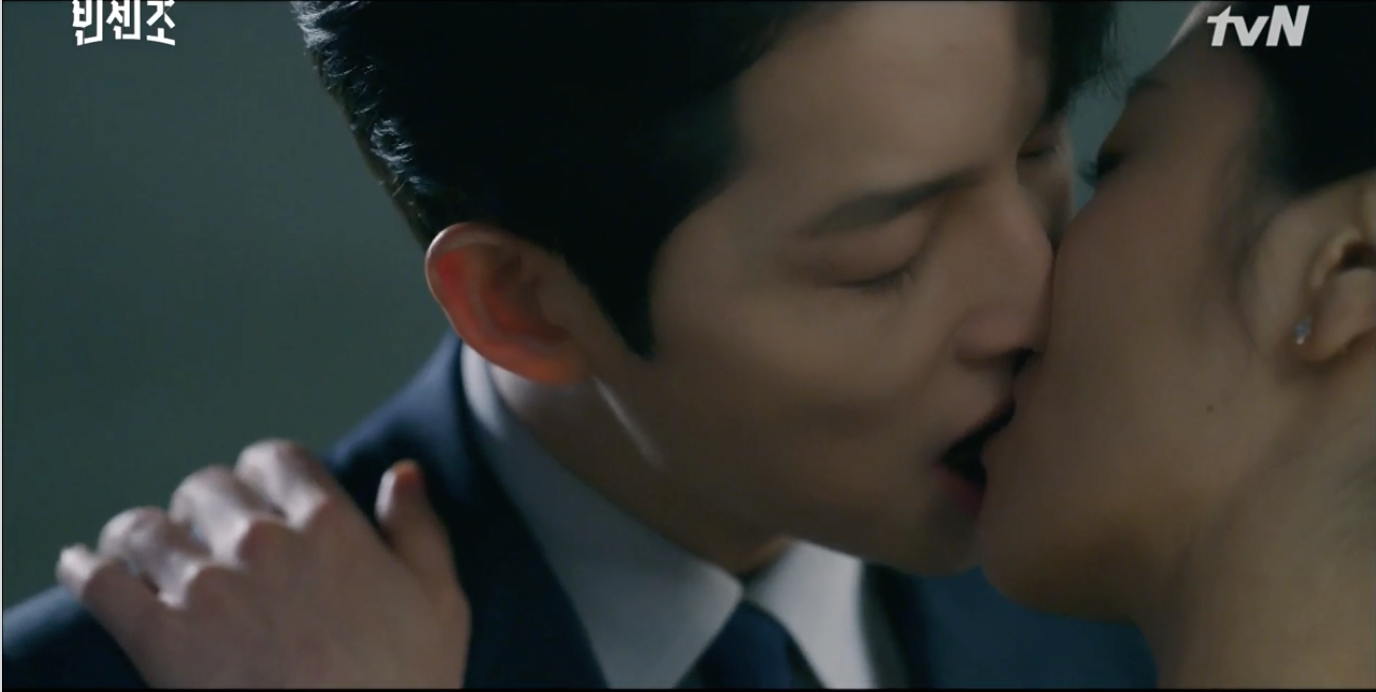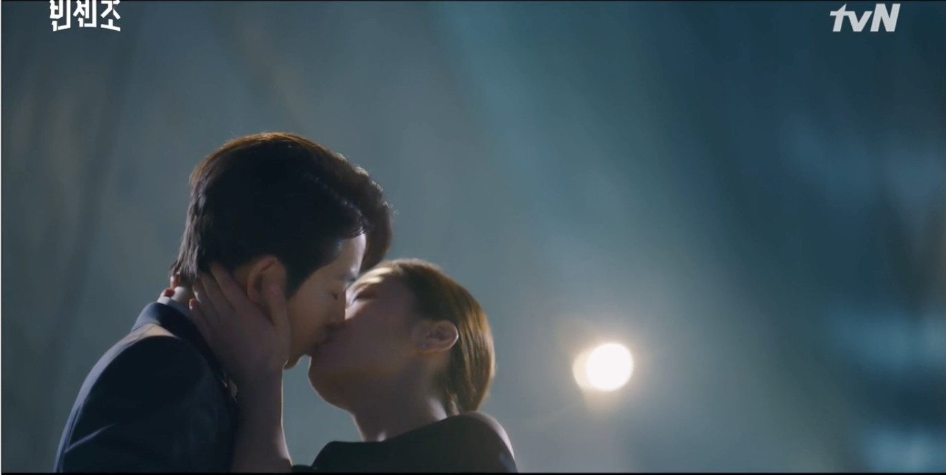 ‘빈센조의 생각을 느끼지 못했다’고 말한 홍차영에게 빈센조는 “이제 느껴지냐 악당은 절대 헤어지지 않는다, 사랑도 독하게 하니까”라며 애정을 드러내며 키스를 했다.