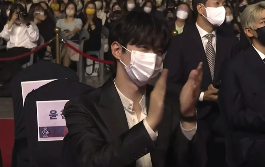 관객석에 앉아있던 이준호는 송중기의 소감을 듣고 박수를 치며 애교스러운 눈빛을 보였다.