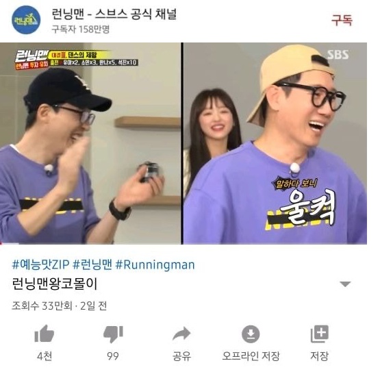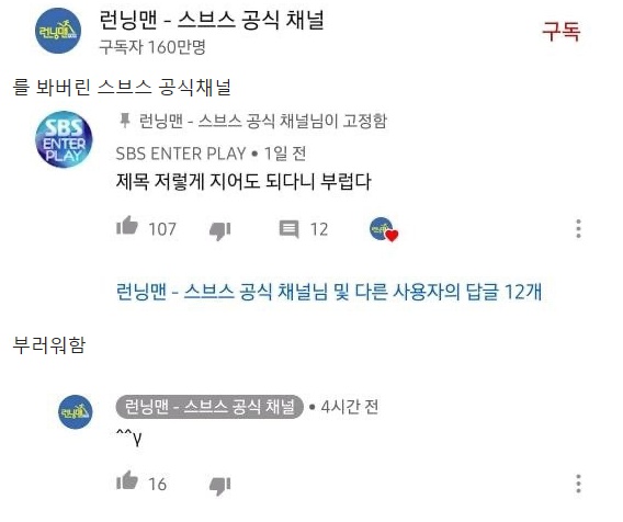 이에 런닝맨 유튜브는 ‘^^V’라고 댓글을 달았다.