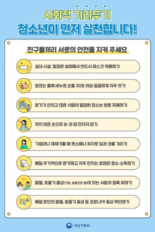 여가부는 ‘사회적 거리두기! 우리 청소년들이 먼저 실천합니다’ 라는 이름으로 다양한 이벤트를 실시한다.