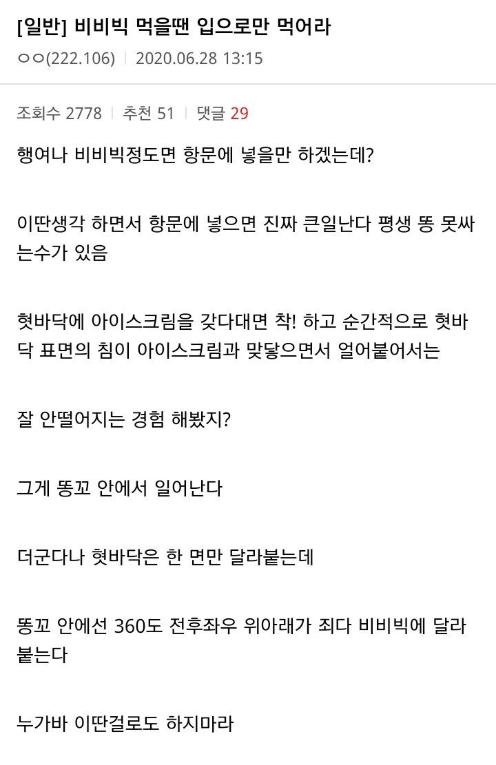 23일 한 온라인 커뮤니티엔 ‘경험자가 말하는 비비빅을 입으로만 먹어야하는 이유’라는 제목의 글이 인기를 끌었다.