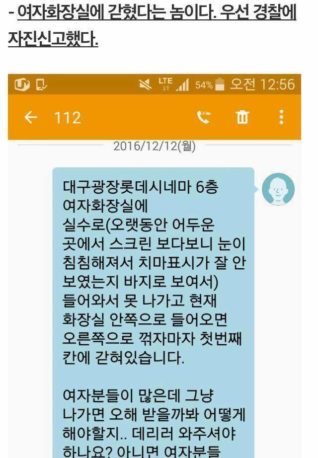 실수로 여자 화장실에 들어와 버린 것.