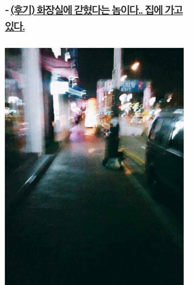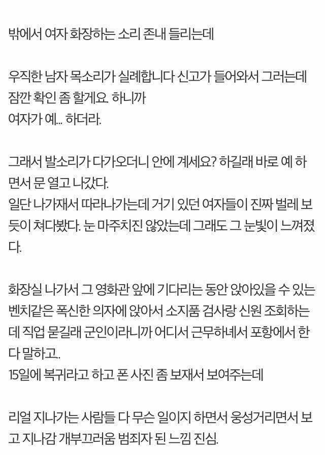 볼 일을 보던 중 밖에서 들리는 소리에 설마 하는 느낌을 받고 우려가 현실이 됐다고 한다.