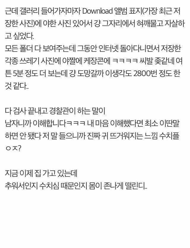 그리고 폰을 검사하기 시작한 경찰, A씨는 평소에 야한 사진들과 이상한 짤들을 가지고 있었어서 도망치고 싶은 심정이었지만 경찰관이 같은 남자라 이해한다며 훈훈하게 마무리 됐다고 한다.