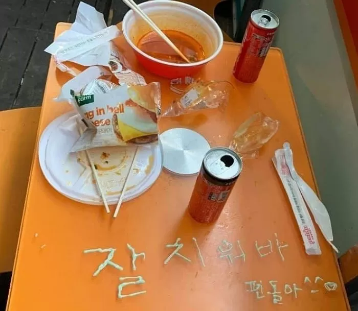 해당 테이블에 앉았던 손님들은 편의점 직원이 테이블을 치워야 한다는 사실을 알고 일부러 이런 메시지를 남긴 것으로 생각할 수 있다.