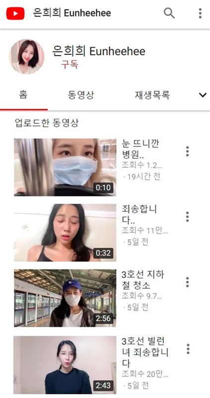 이 여성은 ‘은희희’라는 유튜브 채널에 지난 11일 ‘3호선 빌런녀 죄송합니다’라며 사과 영상을 올렸으며, “9월 9일 일요일 마스크 안 쓰고 다리 올린 점 죄송합니다.