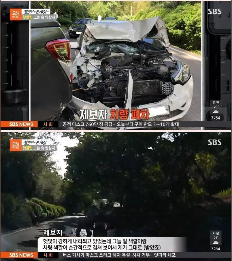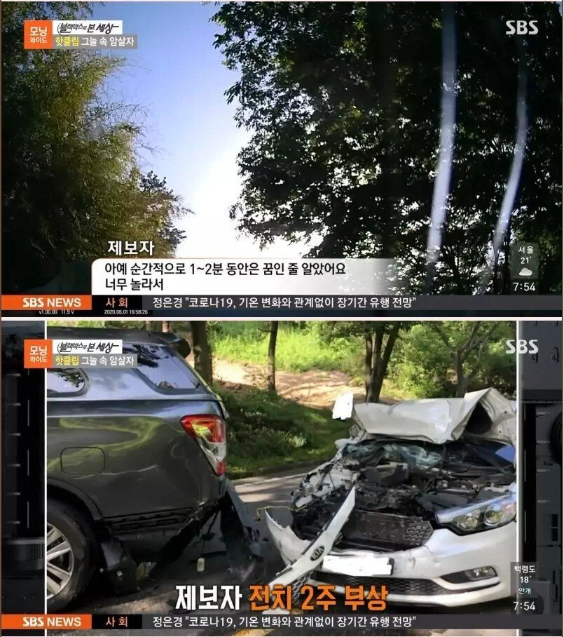 A씨는 “아예 순간적으로 1~2분 동안은 꿈인 줄 알았다. 너무 놀랐다”며 “햇빛이 강하게 내리쬐고 있었는데 그늘 밑 색깔이랑 차량 색깔이 순간적으로 겹쳐 보였다. 제가 그대로 (받았다)”고 설명했다.