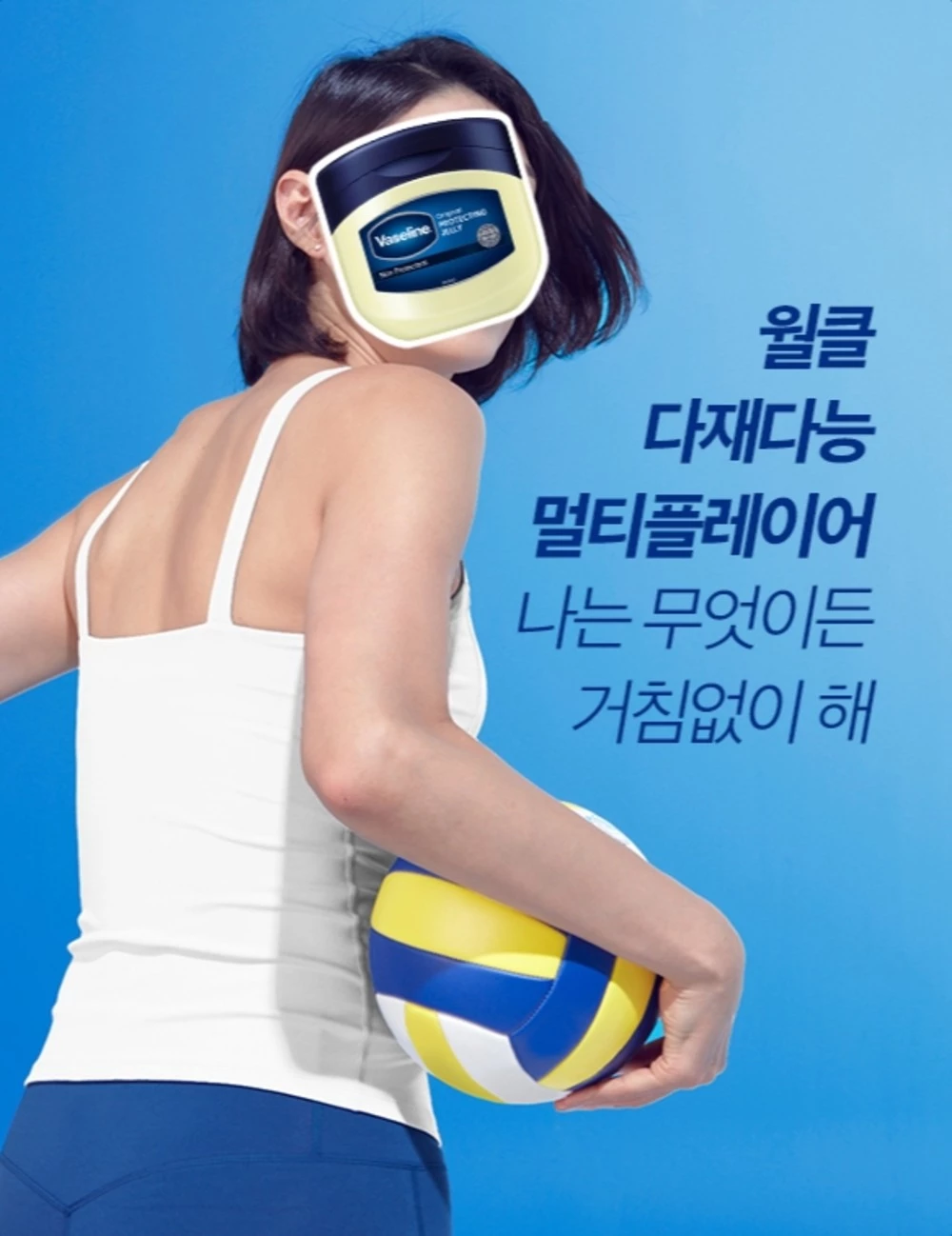 팔과 입술에 바세린 제품을 바르고, 배구 공을 들고 포즈를 잡으며 당당함을 보여주기도 했다.
