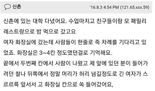 페밀리 레스토랑에서 밥을 먹던 글쓴이는 화장실에 가게 되었고 화장실을 3~4 칸정도의 크지않은 사이즈였다. 줄을 서있던 상황에 드디어 글쓴이의 차례가 왔고 칸으로 들어가려던 찰나에 머리가 긴 여자에게 새치기를 당했다.