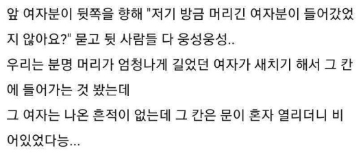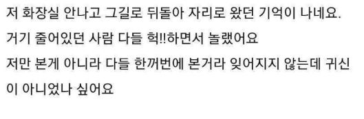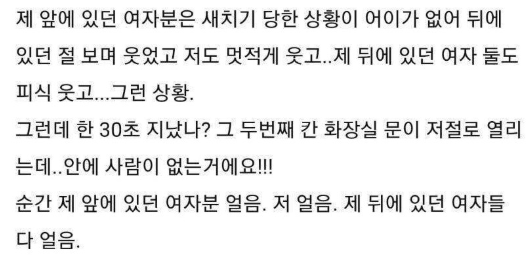 하지만 저절로 열린 화장실 칸 안에는 사람이 없었고 새치기 현장을 모두 목격한 사람들은 화들짝 놀랐다. 이런 글쓴이의 글에 다들 안다는듯한 댓글이 달렸다.