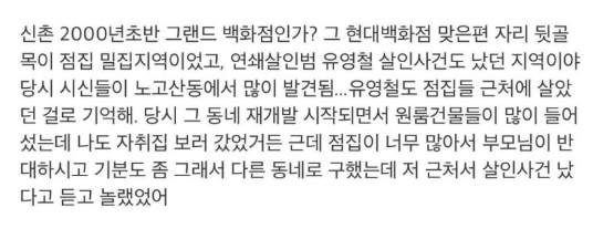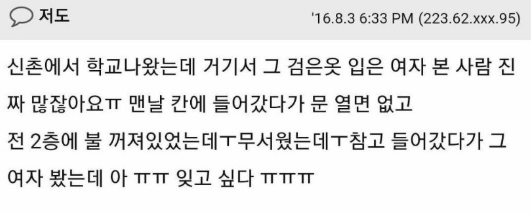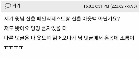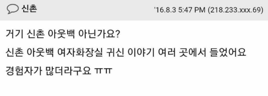 이렇듯 신촌에 유명한 패밀리 레스토랑에서는 사람들에게 유명한 괴담 일화가 있어 많은 이들을 오싹하게 만들었다.