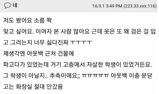 후에 그 귀신의 존재가 어디서 온것인지 추측하는 댓글 또한 달렸다. 오래전부터 많은이들에게 모습을 보인 귀신이며 자살한 학생이다 , 살인사건의 피해자다. 라는 추측성 소문이 많이 났다고 한다.