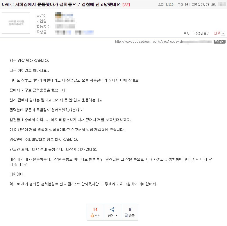 내집에서 내가 운동하는데.. 창문 두뼘도 아니에요 한뼘 반? 열려있는 그 작은 틈으로 지가 봐놓고… 성희롱이라니 .시ㅂ 이게 말이 됩니까?