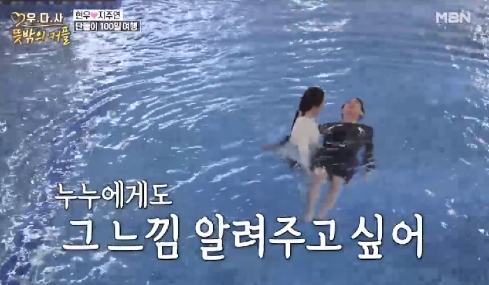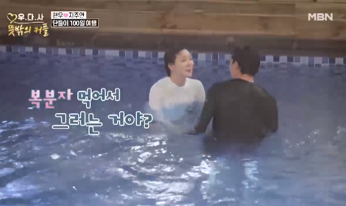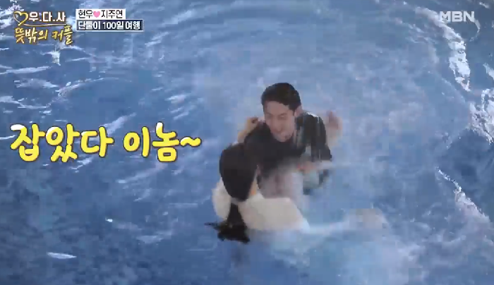 현우는 지주연에게 수영을 배우던 중 포옹을 하고 얼굴을 보며 장난을 쳤다.