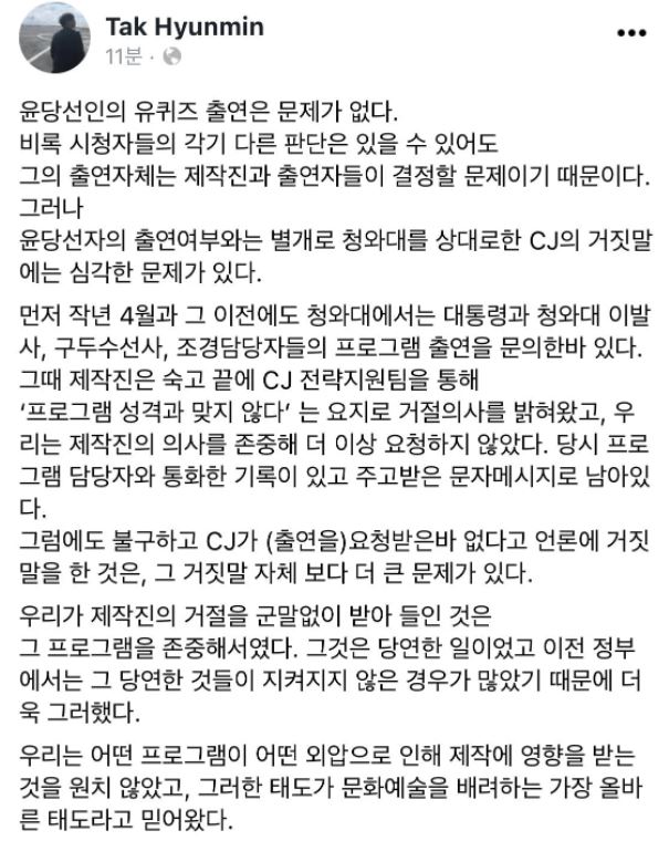 지난 21일 탁현민 청와대 의전비서관은 자신의 페이스북을 통해 “윤 당선인의 ‘유 퀴즈 온 더 블럭’ 출연 여부와 별개로 청와대를 상대로 한 CJ의 거짓말에는 심각한 문제가 있다”고 주장했다.