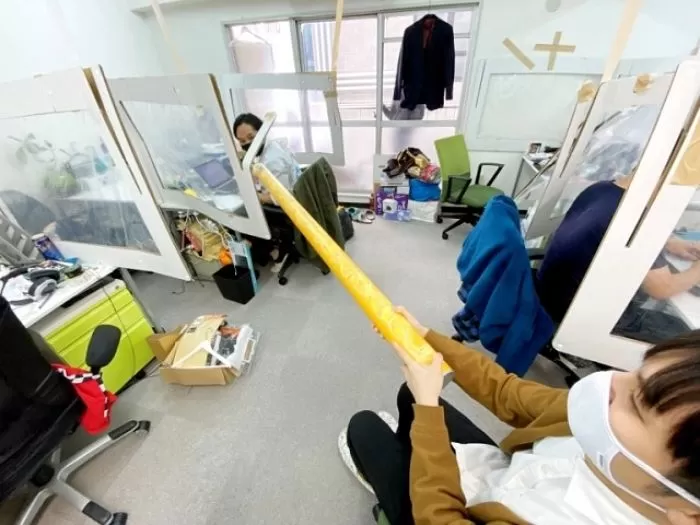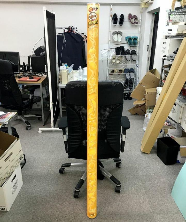 공개된 사진 속에는 초거대 프링글스의 길이를 활용해 옆자리 동료에게 쉽게 전달하는 모습을 확인할 수 있다.