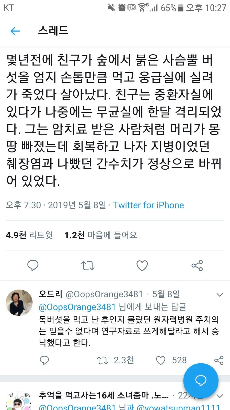 앞서 과거 트위터에는 자신의 친구가 ‘독버섯’을 먹고 지병을 나았다는 증언이 올라왔다.