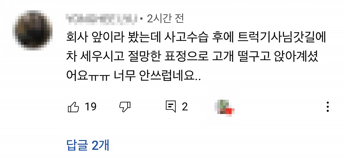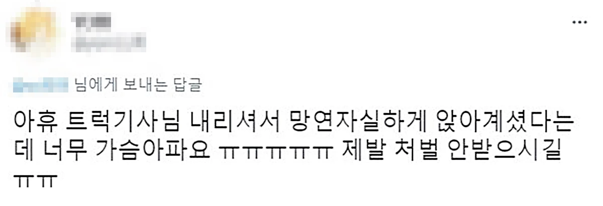 해당 내용을 접한 다른 누리꾼들은 트위터에 “아휴… 트럭 기사님이 내리셔서 망연자실하게 앉아 계셨다는데 너무 가슴 아프다.