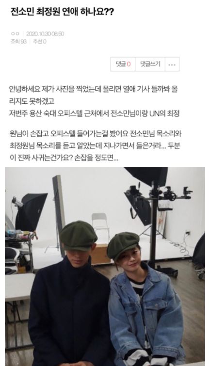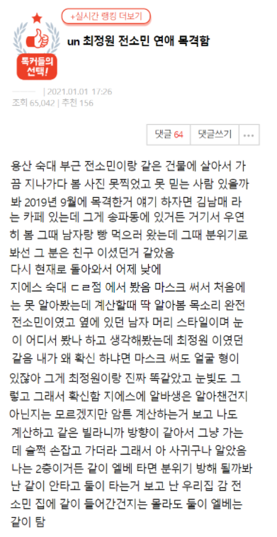이번 글을 보고 네티즌들은 “나 빼고 전부 커플이네 새해부터 에휴”, “뭐냐 저번에도 둘이 목격담 올라오더니 진짠가 보네;;”, “최정원이랑 전소민으로 주작할 급은 아니지 않냐 ㅋㅋㅋㅋㅋ그래서 이게 더 찐인거 같다” 라는 반응을 보이고 있다.