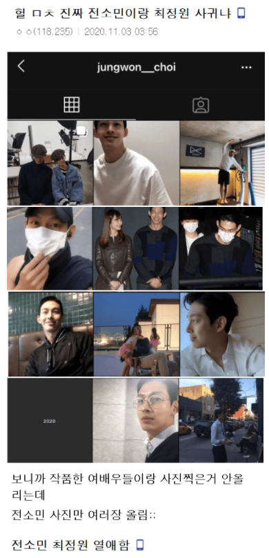 또한 네티즌들 사이에서는 최정원의 인스타그램에는 작품한 여배우들과 사진찍은거 안올리는데 전소민 사진만 여러장 올라와 있다는 이야기가 나오며 둘의 연애에 대한 네티즌들의 확신이 늘고 있다.