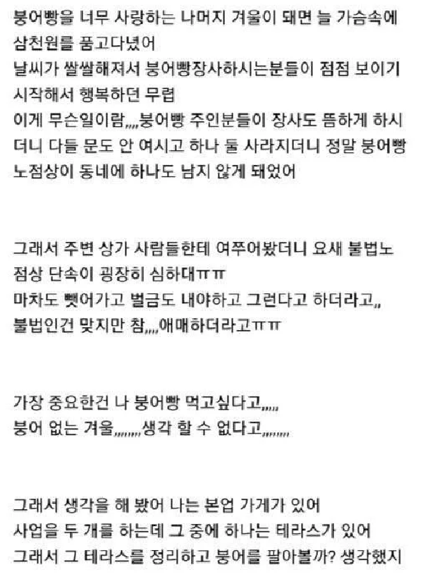 작성자는 “붕어빵을 정말 좋아하는데 불법노정삼 단속이 심해지면서 가게 문을 닫는 곳이 많아졌다.