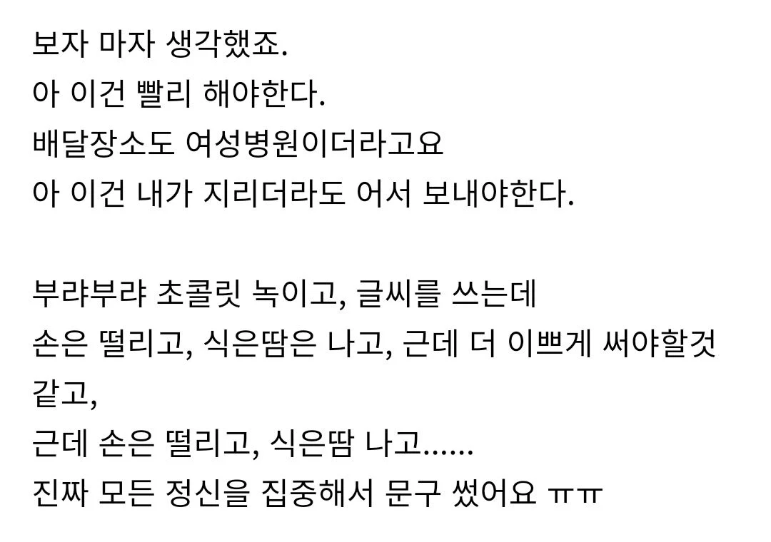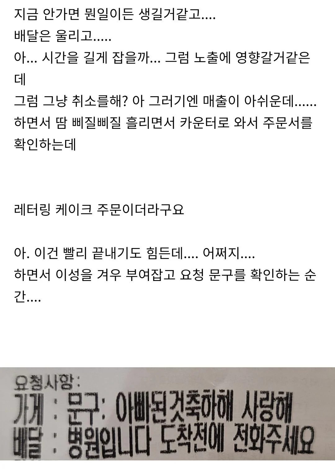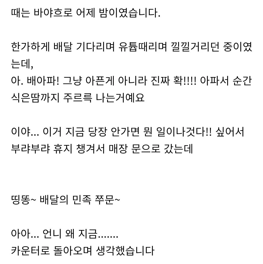 배달을 기다리다가 급하게 대변 신호가 왔음에도 불구하고 손님의 다급한 요청으로 보이는 배달 주문으로 그렇게 급한 대변을 참으면서까지 열심히 조리해서 보내줬다고 한다.