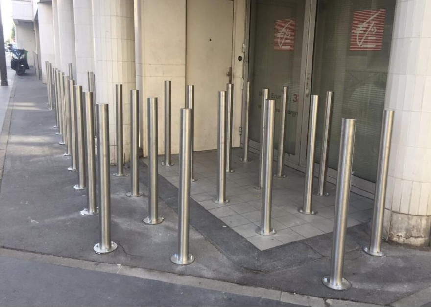 입구에 떡하니 자리 잡은 노숙자 때문에 골머리를 앓던 가게 사장은 결국 차단봉을 설치했다. 노숙자가 앉지 못하도록 철봉 수십 개를 설치한 것.