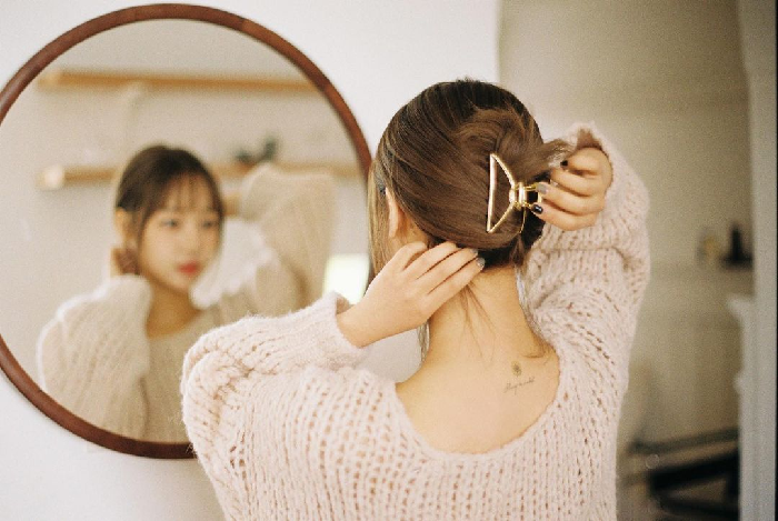 그는 베이지색 니트를 입고 거울을 바라보고 있다. 그의 목 뒤에는 노란색 해바라기와 ‘Always be modest’라는 문구가 그려져 있다.