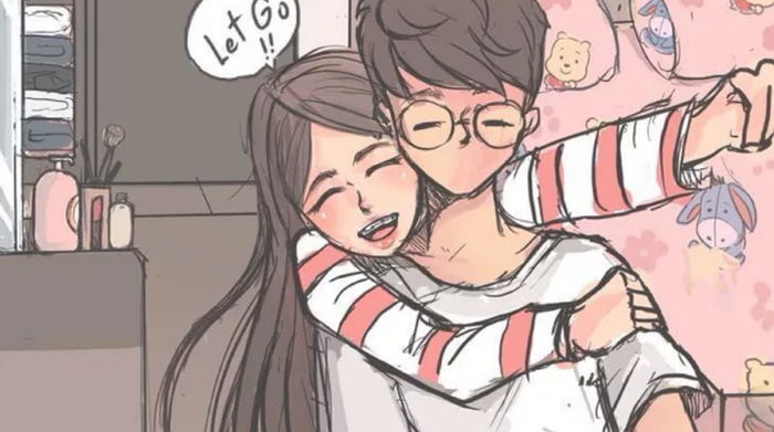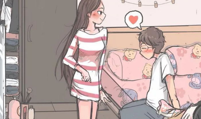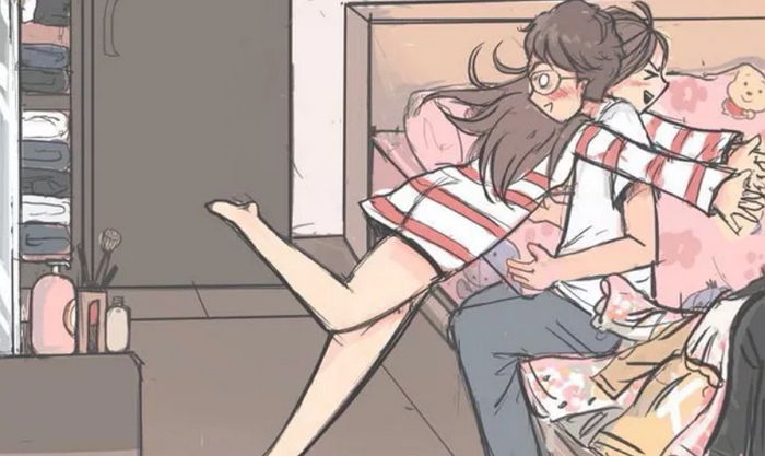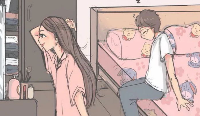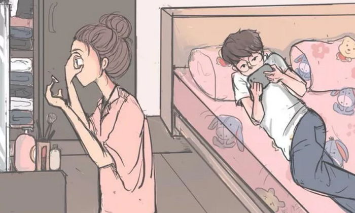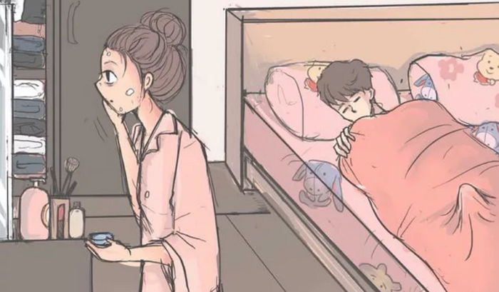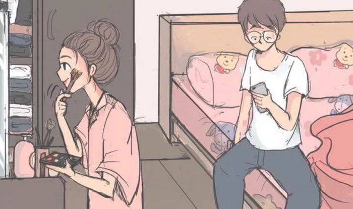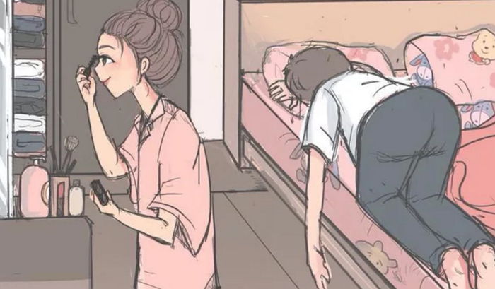 일러스트 속 여자친구는 아침 일찍 눈을 떠 잠자는 남자친구를 뒤로 한 채 기초화장부터 시작한다.