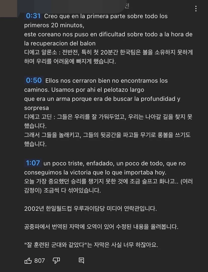 이에 자신이 지난 2002 한일월드컵 우루과이 담당 미디어 연락관이었다는 한 누리꾼은 “지상파에서 번역된 자막에 오역이 있어 수정된 내용을 올려본다”라면서 “‘잘 훈련된 군대와 같았다’라는 자막은 사실 너무 하지 않느냐”라고 지적했다.