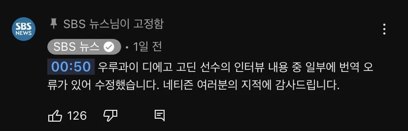 이후 SBS도 오역한 부분을 인정하며 “우루과이 디에고 고딘 선수의 인터뷰 내용 중 일부에 번역 오류가 있어 수정했다. 누리꾼 여러분의 지적에 감사드린다”라고 답글을 남겄다.