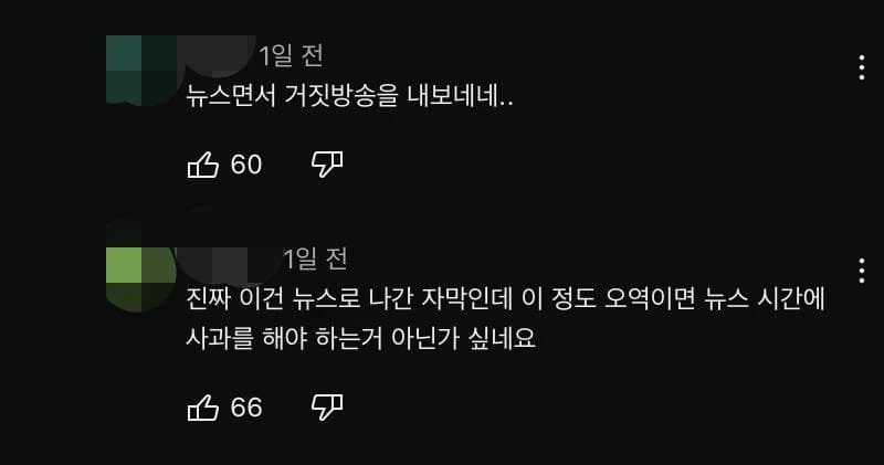 시청자 기만하지 말고”, “오류가 아니라 날조다”, “뉴스면서 거짓 방송을 내보내네”, “진짜 이건 뉴스로 나간 자막인데 이 정도 오역이면 뉴스 시간에 사과해야 하는 게 아닌가”라고 비난했다.