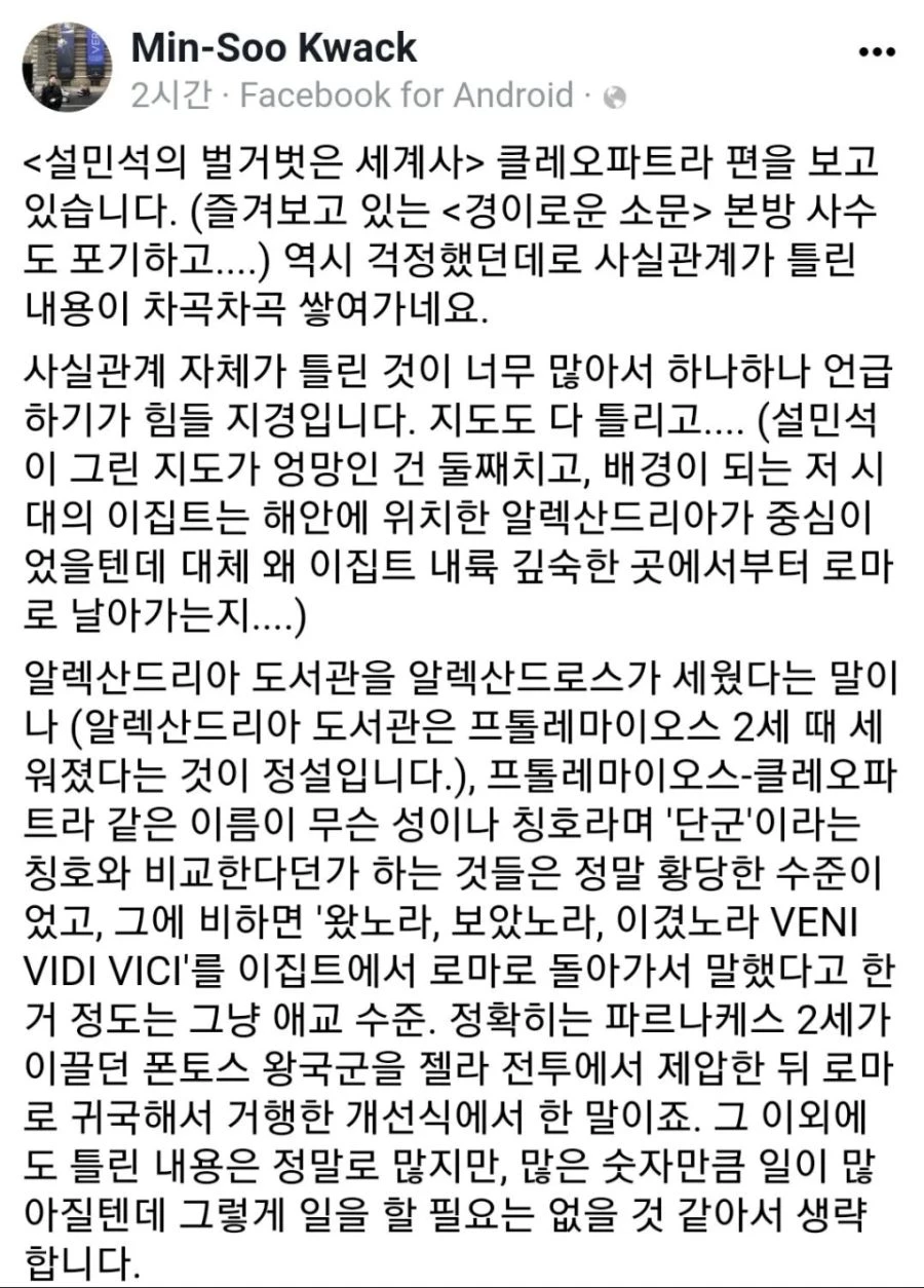 하지만 2회 방송 후 이집트 고고학자인 곽민수 한국 이집트학 연구소장은 20일 페이스북에 “‘설민석의 벌거벗은 세계사’ 클레오파트라 편을 보고 있는데 사실관계 자체가 틀린 게 너무 많아서 하나하나 언급하기가 힘들 지경”이라고 지적했다.