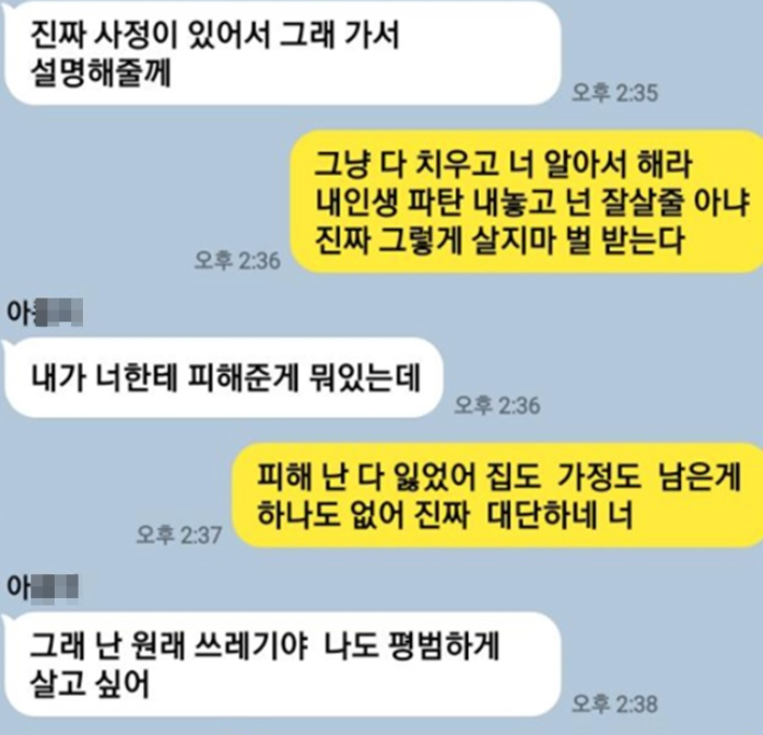 A 씨 아버지에게 전화를 해서까지 이를 따졌지만 상황은 악화됐고, B 씨는 “너 남자랑 있는 것 다 안다. 내 인생 파탄 내놓고 넌 잘 살 줄 아느냐. 그렇게 살지마라 벌 받는다”고 말했다.