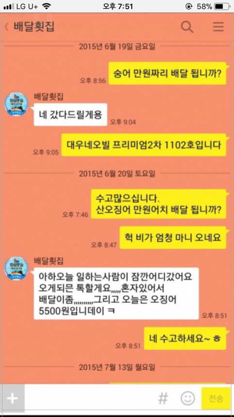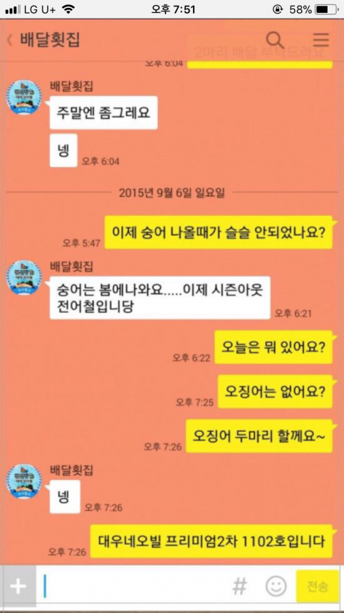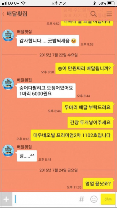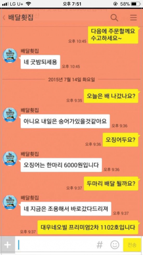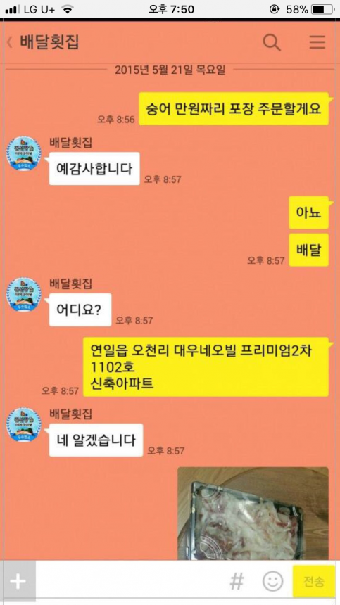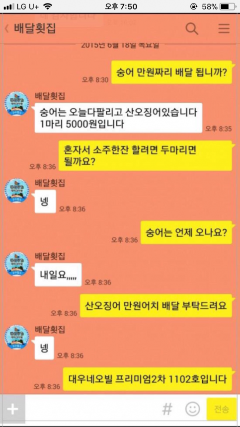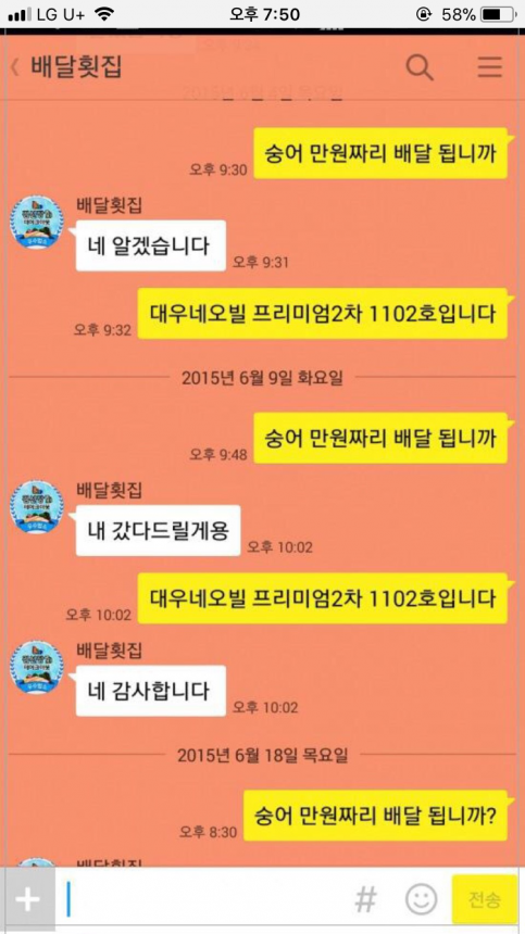 일명 ‘숭어매니아 횟집’으로 불리는 이 가게는 꾸준히 숭어회를 주문하는 카카오톡 대화로 웃음을 자아냈다.