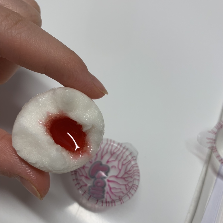 눈알처럼 생긴 젤리를 씹으면 안에서 딸기잼같은 액체가 흘러나온다.
