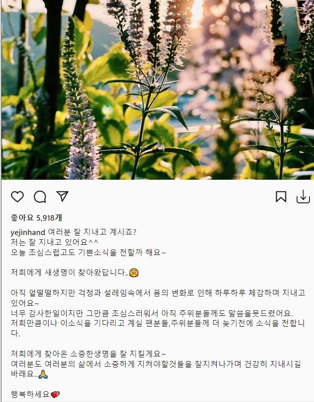 이어 “오늘 조심스럽고도 기쁜 소식을 전할까 한다. 저희에게 새 생명이 찾아왔다”며 임신 소식을 전했다.