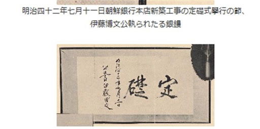 21일 문화재청은 서체 관련 전문가 자문단을 통해 한국은행 본관의 정초석(머릿돌)의 ‘定礎(정초)’ 글씨가 이토 히로부미의 친필임을 확인했다고 밝혔다.